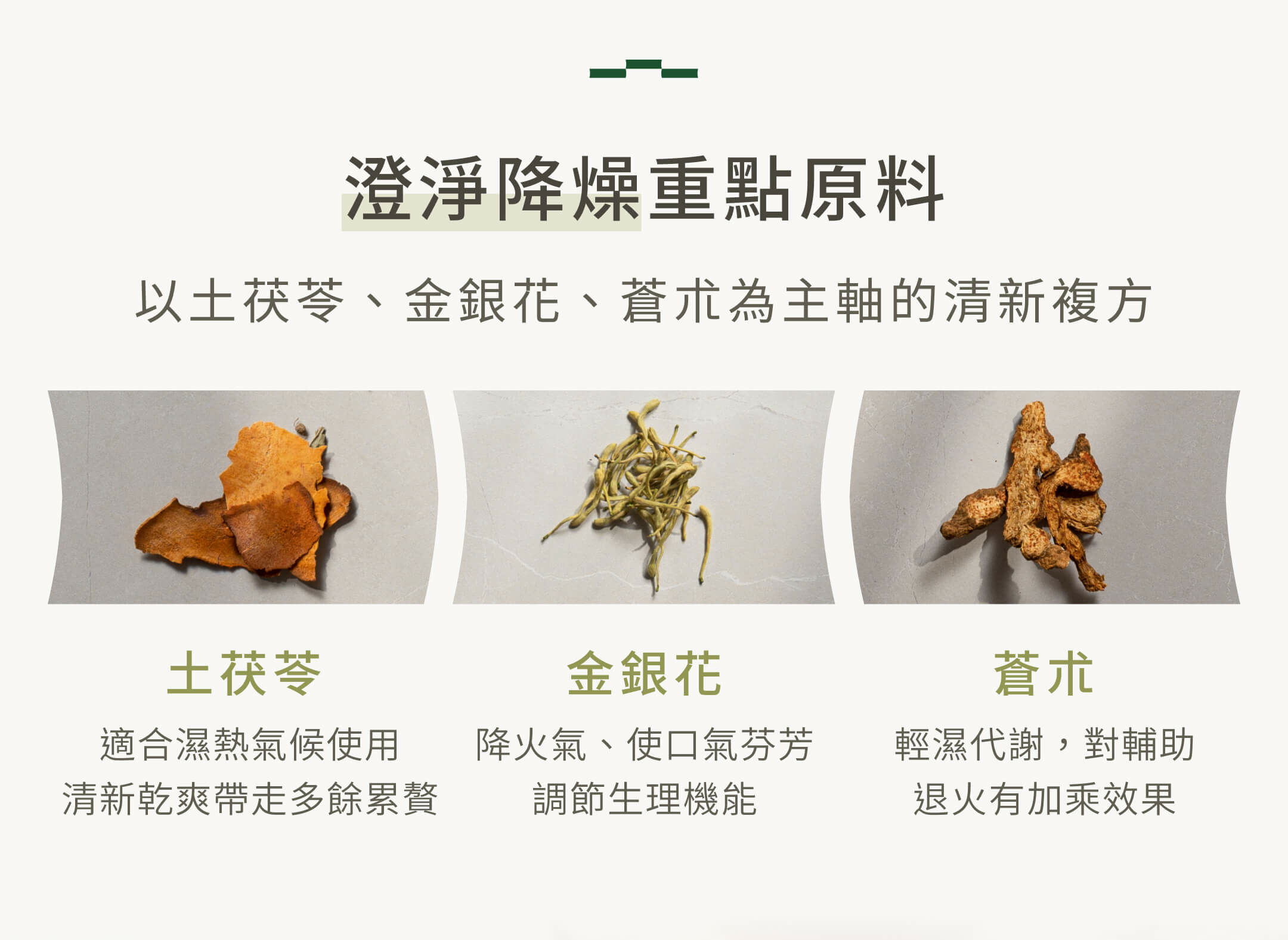 ✓ 土茯苓、金銀花、蒼朮為主軸的清新複方
